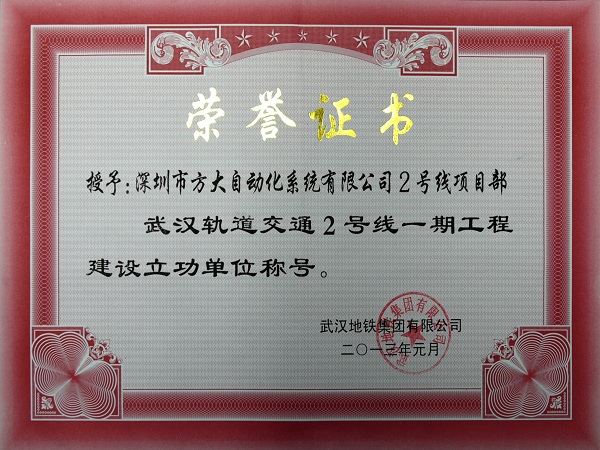 近日,為表彰方大自動(dòng)化系統(tǒng)有限公司在武漢地鐵2號(hào)線一期工程中的突出貢獻(xiàn),武漢地鐵集團(tuán)有限公司授予方大自動(dòng)化系統(tǒng)有限公司為 “武漢軌道交通2號(hào)線一期工程建設(shè)立功單位”稱(chēng)號(hào)。