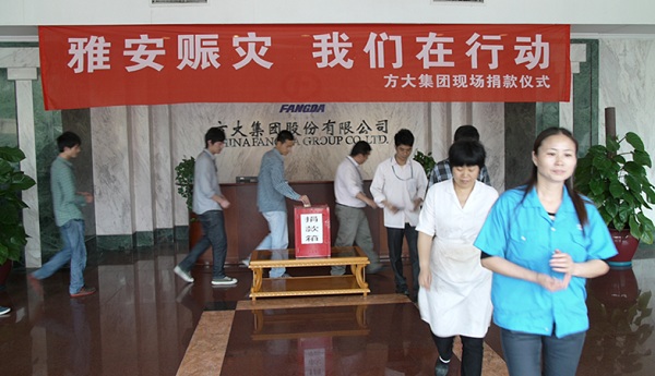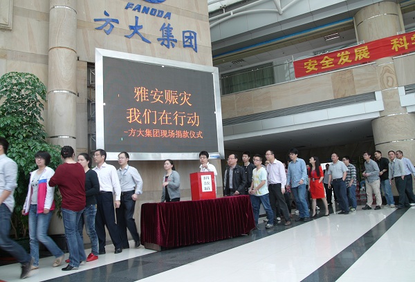 4月20日8時02分,四川省雅安市蘆山縣發(fā)生7.0級地震,人民生命財產(chǎn)遭受重大損失。一方有難,八方支援。在雅安人民在遭受災(zāi)難的時候,方大集團(tuán)在第一時間號召集團(tuán)全體員工為災(zāi)區(qū)捐款,支持雅安人民抗震救災(zāi)。集團(tuán)總部和分布在北京、上海、成都、沈陽、南昌、東莞等全國各地的方大集團(tuán)員工紛紛捐款,以實(shí)際行動獻(xiàn)愛心。據(jù)不完全統(tǒng)計,截至4月23日,方大集團(tuán)已經(jīng)向雅安地震災(zāi)區(qū)捐款已達(dá)257462元,以幫助災(zāi)區(qū)人民重建家園,與災(zāi)區(qū)人民一起共渡危難。這也是繼向汶川、玉樹地震災(zāi)區(qū)捐款后,方大集團(tuán)再一次向震區(qū)人民伸出援手,是方大集團(tuán)“報國報民報一方”大愛精神的再次彰顯。
